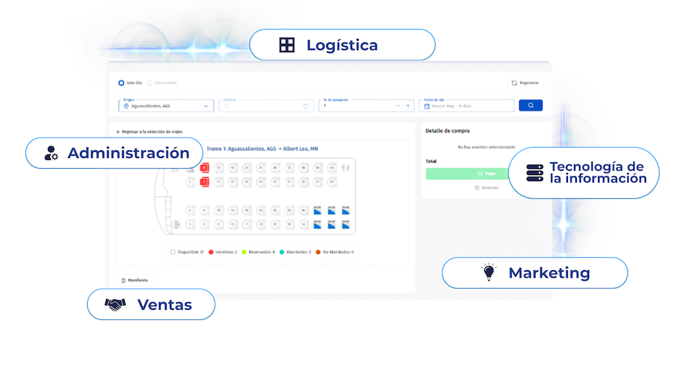 Transforma tus operaciones con herramientas digitales que abarcan venta de boletos, envíos de paquetería, marketing inteligente, análisis de datos y IA en un solo lugar.